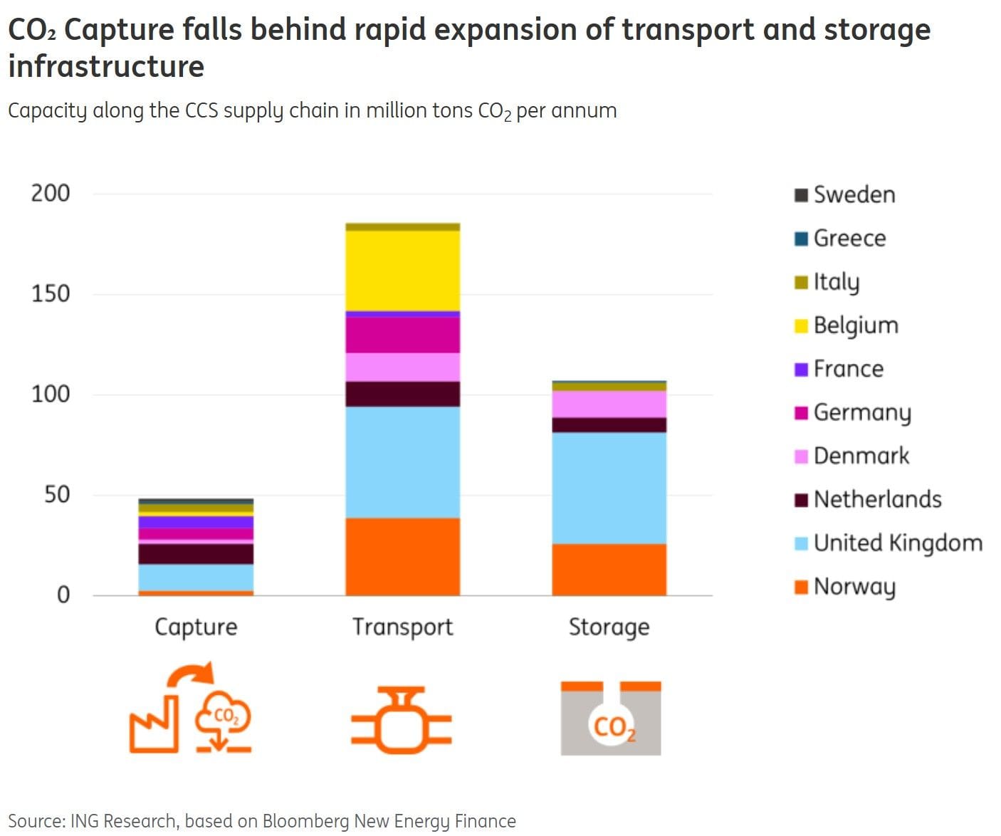 CO₂-afvang | Europa loopt het risico tegen 2030 meer capaciteit te hebben voor CO₂-transport en -opslag dan voor daadwerkelijke afvang. Dat blijkt uit de Energy Outlook van ING. Zonder betere afstemming tussen infrastructuur en vraag van uitstoters dreigen zinloze miljardeninvesteringen in opslag en pijpleidingen. Zie de grafiek hieronder, en lees hier meer