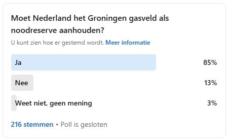 noodreserve | Circa 85 procent van de respondenten op LinkedIn vindt dat Nederland het Groningen gasveld achter de hand moet houden als noodreserve. Nederland en de Europese Unie zijn te afhankelijk van onbetrouwbare gasleveranciers. Lees hier ook de discussie onder de peiling.